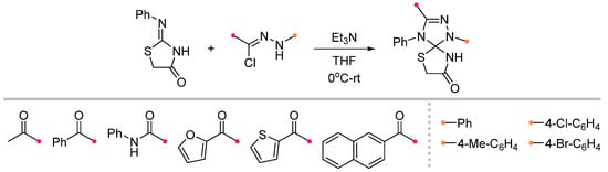 - Dalloul, H.M. Synthesis of Spiro-Heterocycles with the Thiazolidinone Moiety from Nitrilimines. J. Chin. Chem. Soc. 2009, 56, 196–201. [Google Scholar] [CrossRef]