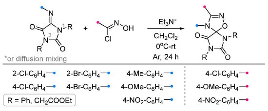 - Petrova, J.V.; Tkachenko, V.T.; Tafeenko, V.A.; Pestretsova, A.S.; Pokrovsky, V.S.; Kukushkin, M.E.; Beloglazkina, E.K. Facile Synthesis of Hydantoin/1,2,4-Oxadiazoline Spiro-Compounds via 1,3-Dipolar Cycloaddition of Nitrile Oxides to 5-Iminohydantoins. Beilstein J. Org. Chem. 2025, 21, 1552–1560. [Google Scholar] [CrossRef]