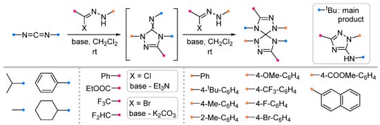 - Zhou, Y.; Li, X.; Liu, X.; Huang, D.; Wang, K.-H.; Wang, J.; Hu, Y. Synthesis of Di/Trifluoromethyl Bis(1,2,4-Triazoline)Spiranes and 1,2,4-Triazoles via 1,3-Dipolar Cycloaddition of Nitrilimines and Carbodiimides. Org. Biomol. Chem. 2025, 23, 2662–2671. [Google Scholar] [CrossRef] [PubMed]