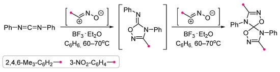 ![]() | ![]() | 1 b/2 or 1 c/1 | 50–75 | C6H6, rt to 60–70 °C, 20–30 min | BF3⋅Et2O catalyzed reactions (equal amount relative to dipole). Benzonitrile oxides were used themselves. The method is suitable for carbodiimides as well as independently synthesized substrates. | [71] |