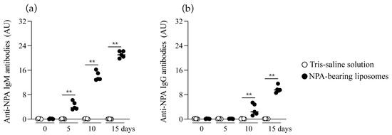 Mice that received NPA-bearing liposomes produce IgM and IgG anti-NPA antibodies. Detection of anti-NPA antibodies by liposomal ELISA. (a) IgM and (b) IgG anti-NPA antibodies were analyzed in the serum of mice before administration of the Tris–saline solution or NPA-bearing liposomes, and on days 5, 10, and 15 after administration. Antibody titers are shown as arbitrary units (AU). The Mann–Whitney test was used to determine significant differences between the study groups at the indicated times (** p ≤ 0.01).