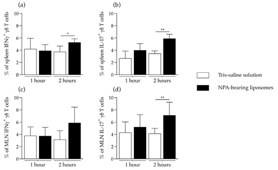 IFNγ and IL-17 production in response to NPAs by γδ T cells from mice that produce anti-NPA antibodies. Percentage of γδ T cells that produce (a,c) IFNγ or (b,d) IL-17 from the (a,b) spleens or the (c,d) mesenteric lymph nodes (MLN) from mice that received Tris–saline solution or NPA-bearing liposomes, after re-stimulation of the cell suspensions with NPA-bearing liposomes for 1 or 2 h. To determine statistically significant differences between study groups at a specific time, the Mann–Whitney test was used (* p ≤ 0.05; ** p ≤ 0.01). Five cell suspensions from spleen or MLN from each of five mice administered with NPA-bearing liposomes or with Tris–saline solution for 15 days were analyzed for each condition at each time.