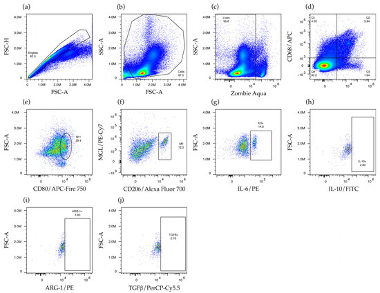Flow cytometry strategy for the identification and characterization of macrophages. Cell suspensions were stained with specific antibodies against M1 and M2 macrophage markers. First, (a) single events were selected, then (b) cellular debris and (c) dead cells were excluded. Subsequently, (d) macrophages positive for CD68 and F4/80, along with (e) M1 macrophages positive for CD80 and (f) M2 macrophages positive for CD206 and macrophage galactose-type lectin (MGL), were selected. Finally, M1 macrophages that produce (g) IL-6 and M2 macrophages that produce (h) IL-10, (i) arginase 1 (ARG-1), or (j) TGFβ were selected.