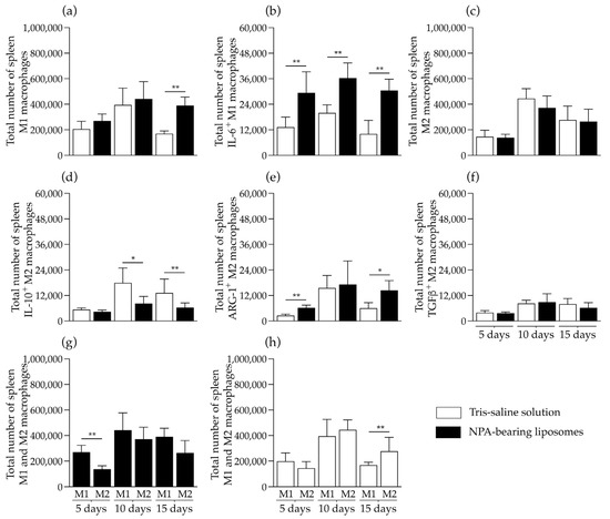 NPA-bearing liposomes induce M1 macrophage polarization in mouse spleens. Numbers of (a,g,h) M1 and (c,g,h) M2 macrophages, (b) IL-6-producing M1 macrophages, and (d) IL-10-, (e) arginase 1-(ARG-1), or (f) TGFβ-producing M2 macrophages from the spleens of mice on days 5, 10, and 15 after Tris–saline solution or NPA-bearing liposomes administration. To determine statistically significant differences between study groups at a specific time, or between M1 and M2 macrophages at a specific time within the same group, the Mann–Whitney test was used (* p ≤ 0.05; ** p ≤ 0.01). The spleens from five mice administered with NPA-bearing liposomes or with Tris–saline solution were analyzed for each condition at each time.