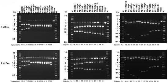 Among more than 100 candidate target sites, we manually selected 39 crRNAs and tested their ability to cleave HPV16 DNA segments in vitro. Most of the crRNAs efficiently digested the DNA at the expected sites (Figure 1), while a few crRNAs, such as AS869G, S884G, and AS1192g+, exhibited lower activity in two independent experiments (indicated by star marks). These findings suggest that DN-gRNA sets, including AS507G/S563g+, AS706g+/S753G, and AS859G/S893G, are promising candidates for further investigation using the double-nicking strategy.