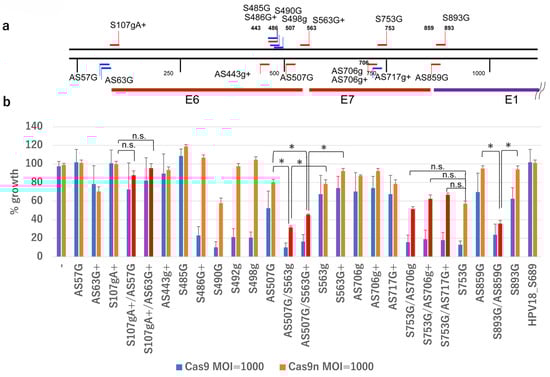 Growth inhibitory activity of representative gRNAs targeting HPV16 DNA. (a) Representative gRNAs on the map of the HPV16 genome, along with the coding sequences of E6, E7, and E1, are indicated. (b) Growth of SiHa cells expressing the indicated gRNA(s) and infected with AdV expressing Cas9 or Cas9n at an MOI of 1000 was measured. Statistical analysis was conducted using a t-test. Asterisks indicate a p-value < 0.05, and ‘n.s.’ indicates not significant.