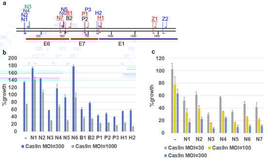 Growth inhibitory activity of representative DN-gRNAs targeting HPV16 DNA. (a) Schematic representation of representative DN-gRNAs on the map of the HPV16 genome, including the coding sequences of E6, E7, and E1. The gRNAs on the antisense strand for N5, N6, and N7 are common, and the gRNAs on the sense strand for P1, P2, and P3 are common. (b) Growth of SiHa cells expressing the indicated DN-gRNAs, infected with AdV expressing Cas9n at an MOI of 300 or 1000. The means of triplicate wells and error bars are shown. (c) Growth of SCC90 cells expressing the indicated DN-gRNAs, infected with AdV expressing Cas9n at an MOI of 30, 100, or 300. The means of triplicate wells and error bars are shown. In vitro Cas9 activity with various crRNAs.
