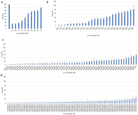 Given the effectiveness of DN-gRNAs (N3, B1, B2, P1, P2, P3, H1, H2) in the SiHa cell lines, we tested combinations of up to four DN-gRNAs, including two additional DN-gRNAs (Z1 and Z2) targeting the E1 region (Figure 4a). More than 90% growth inhibition was observed in six of 22 combinations of two DN-gRNAs (Figure 4b, from B1Z2 to H2P1), 20 of 37 combinations of three DN-gRNAs (Figure 4c, from H1B1P1 to H1P1Z1), and 37 of 49 combinations of four DN-gRNAs (Figure 4d, up to N3P3B2Z1), but none of single sets of DN-gRNAs at an MOI of 250 (Figure 4a). These results indicate an additive or synergistic effect of multiplex DN-gRNAs. Considering that B1, B2, P1, P2, and H1 had no SNVs in any of the HPV16 sublineages, the combination of B1, P1, and H1 emerged as the most effective for targeting the E6/E7 region.