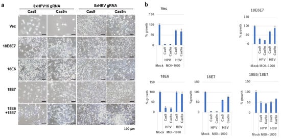 Growth inhibitory activity of Ax-Set2 and AxCB-Cas9 or AxCB-Cas9n on SiHa cells expressing HPV18 E6, E7, or E6E7. SiHa cells expressing HPV18 E6, E7, E6E7, 18E6 plus E7, or the LXSN vector were infected with Ax-Set2 (8xHPV16 gRNA), Axg8HBV-X (8xHBV gRNA)16 and AxCB-Cas9 or AxCB-Cas9n at an MOI. of 1000. (a) Representative images of SiHa cells 10 days post-infection are presented. Scale bars represent 100 μm. (b) Growth of SiHa cells 10 days post-infection was measured by the SRB assay and is shown in bar graphs. The means of triplicate wells and error bars are indicated.