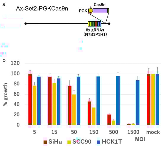 Growth of SiHa, SCC90, and HCK1T cells infected with Ax-Set2-PGKCas9n at the indicated MOI. (a) Schematic structure of Ax-Set2-PGKCas9n. (b) SiHa, SCC90, and HCK1T cells were infected with Ax-Set2-PGKCas9n at the indicated MOI. Growth of the cells was measured by the SRB assay and is shown in bar graphs. The means of triplicate wells and error bars are indicated. The means of mock-infected cells were set at 100%.