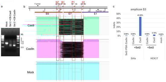 Potential off-target sites for 8 gRNAs were identified using CRISPRdirect (https://crispr.dbcls.jp/, accessed on 28 August 2025) []. Criteria for selection included a perfect match of 12 out of 19 target nucleotides at the 3′ end, the presence of an NGG PAM sequence, and no more than four mismatches in the remaining 7 nucleotides at the 5′ end. Ten putative off-target sites were amplified via PCR using primer sets (Supplementary Table S2). The PCR products (100 ng) were subjected to library preparation using the NEBNext Ultra II DNA Library Prep Kit (New England Biolabs, Ipswich, MA, USA). The libraries were pooled and sequenced with 150 bp paired-end reads on the MiSeq platform (Illumina, San Diego, CA, USA), according to the manufacturer’s instructions. The FASTQ files were generated using the Local Run Manager software (v4.1.0) (Illumina) and aligned to the GRCh38 reference to generate BAM files. After converting from BAM to SAM format using SAMtools (v1.13) [], each pair of reads, R1 and R2, was connected by overlapping bases. The connected reads were re-aligned to the GRCh38 reference. Finally, reads with Cas9/Cas9n-mediated indels were extracted based on the Compact Ideosyncratic Gapped Alignment Report (CIGAR) strings from the BAM files.