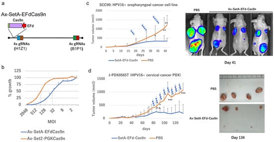 Growth inhibition of HPV16-positive cells and tumors by “All-in-One” AdV targeting HPV16. (a) Schematic structure of Ax-SetA-EFdCas9n. (b) Growth of SiHa cells infected with Ax-Set2-PGKCas9n or Ax-SetA-EFdCas9n. Growth of SiHa cells infected with Ax-Set2-PGKCas9n (red line) or Ax-SetA-EFdCas9n (blue line) at the indicated MOI. The means of triplicated wells and error bars are plotted. (c) Tumor growth of SCC90 cells expressing Click beetle luciferase mutant (CBR2). A total of 3 × 106 SCC90 cells expressing CBR2 luciferase [] were injected under the dorsal skin of nude mice on day 0. Ax-SetA-EFdCas9n AdV or PBS was intratumorally injected 12 times, as indicated by the blue arrows. Depending on the batch of purified AdVs, different amounts of AdV (0.4 to 4 × 1010 pfu/site) were injected on the following days: day 21, 22, and 23 (2.1 × 1010 pfu/site); day 27, 28, and 29 (2.4 × 1010 pfu/site); day 30 (1.2 × 1010 pfu/site); day 33 (2.3 × 1010 pfu/site); day 34 (4.0 × 1010 pfu/site); day 35 (4.0 × 109 pfu/site); and day 36 and 37 (2.5 × 1010 pfu/site). IVIS images were taken on day 41, as described in the Materials and Methods. (d) Tumor growth of PDX-CC1 tumors. Pieces of the 4th generation of an HPV16-positive PDX-CC1 tumor (approximately 10 mm3) were subcutaneously transplanted under the dorsal skin of nude mice on day 0. Ax-SetA-EFdCas9n AdV (2 × 1010 pfu/site) or PBS was intratumorally injected once a day for three consecutive days per week from day 78 to day 129, as indicated by the blue arrows. Photographs of excised tumors on day 134 are presented. Note that the largest tumor in the experimental group had a couple of ulcers, and the majority of the injected AdV fluid leaked through the ulcers. The statistical analysis was conducted using a t-test. Asterisks: *** indicates p-value < 0.01, ** indicates p-value < 0.02, and * indicates p-value < 0.05. “n.s.” indicates not significant (p-value > 0.05).