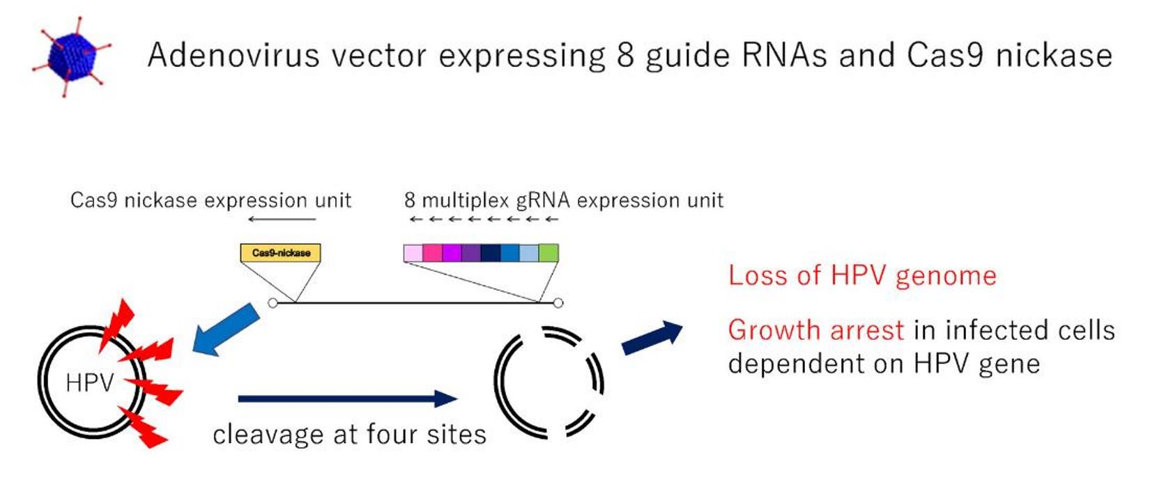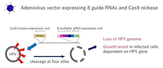 Yamaji, M.; Nakahara, T.; Nakanishi, T.; Aoyama-Kikawa, S.; Yamaguchi, K.; Furukawa, Y.; Nakamura, M.; Okada, T.; Tabata, H.; Fuse, R.; et al. Disruption of Human Papillomavirus 16 E6/E7 Genes Using All-in-One Adenovirus Vectors Expressing Eight Double-Nicking Guide RNAs. Int. J. Mol. Sci. 2025, 26, 8685. https://doi.org/10.3390/ijms26178685