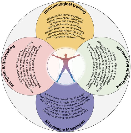 A multidimensional rehabilitation framework. This framework represents the interplay between key components essential to a comprehensive medical rehabilitation paradigm, ensuring internal homeostasis conducive to healing and optimal function—1. Regenerative Medicine: Focuses on repairing and regenerating damaged tissues and organs using techniques such as stem cell therapy, tissue engineering, and biomaterials. These methods provide the structural foundation for recovery and rehabilitation. 2. Homeostatic interventions: It focuses on restoring and maintaining internal equilibrium, addressing systemic imbalances that can hinder recovery. 3. Immunological Training: Enhances the immune system’s capacity to respond effectively to injuries and infections. Strategies include controlled antigen exposure, immunotherapy, and exercise-induced immune modulation to build resilience and facilitate recovery. 4. Microbiome Modulation: Explores the pivotal role of the gut microbiome in health and disease. These components converge in a holistic rehabilitation program (Integrated approach) addressing physical, immunological, and metabolic needs of the patient. Each component is integrated dynamically across the rehabilitation timeline. Personalized interventions are developed to optimize recovery, improve functional outcomes, and enhance quality of life.