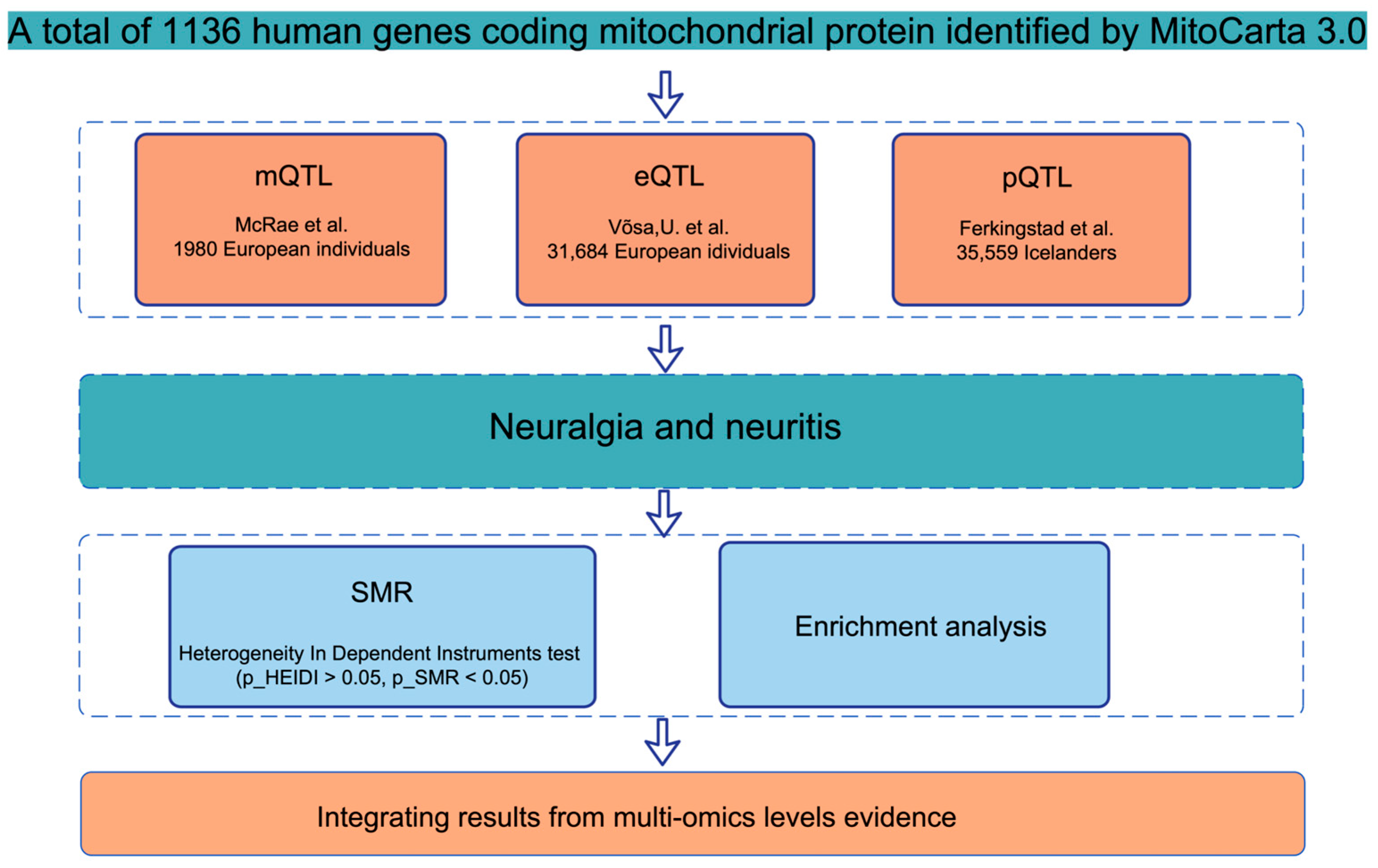 2.1. Integrated Multi-Omics SMR Identifies Candidate Mitochondrial Genes Associated with Pain Phenotypes