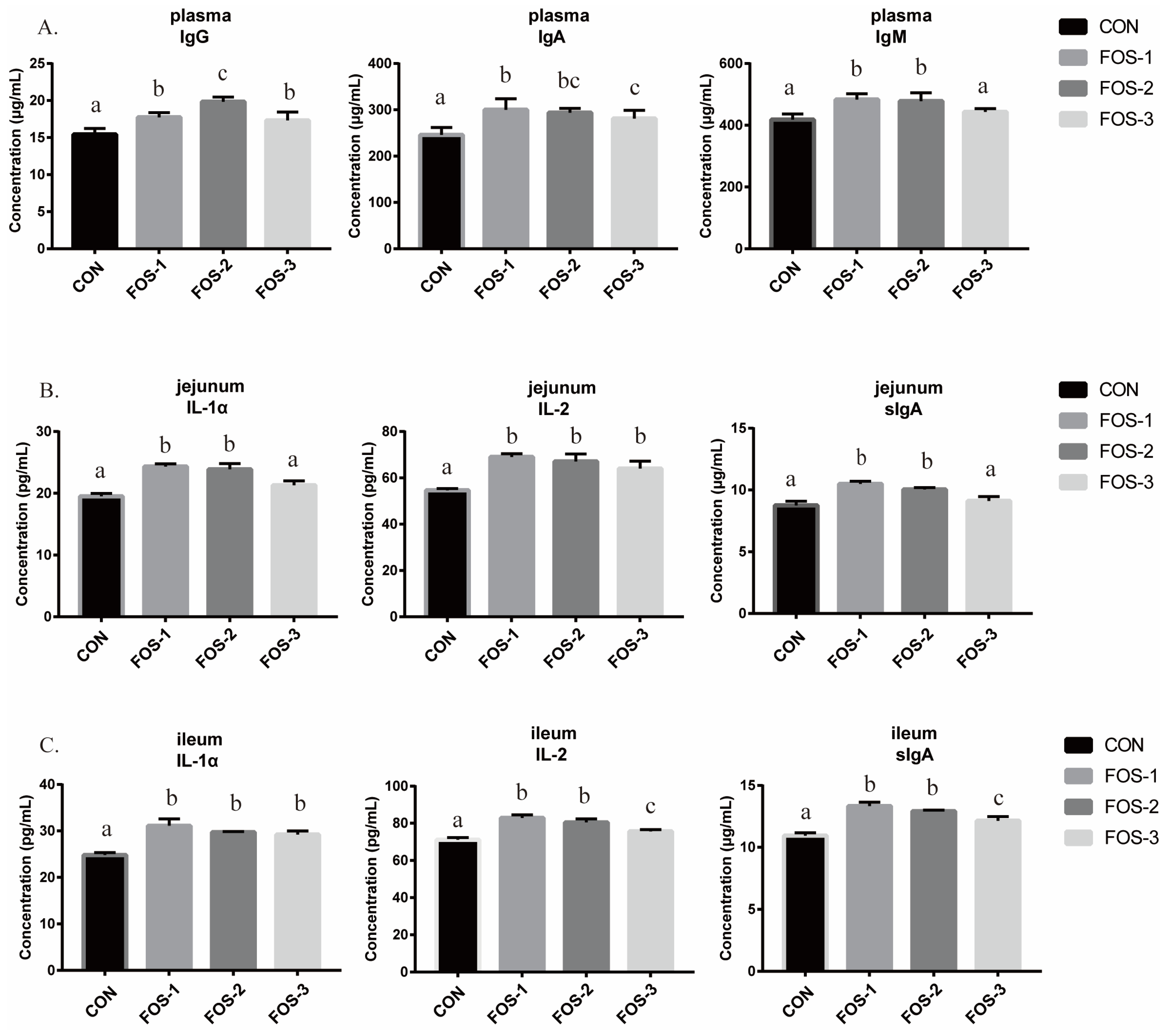 Figure 1A, the FOS supplemental in the diet could significantly increase the serum levels of IgA, IgG, and IgM in growing rabbits compared to the control group. Among these groups, the 0.6% supplementation group exhibited the optimal enhancement of humoral immunity. Interleukin-2 (IL-2) and interleukin-1α (IL-1α) are involved in numerous normal physiologic processes and contribute to the modulation of various inflammatory diseases [