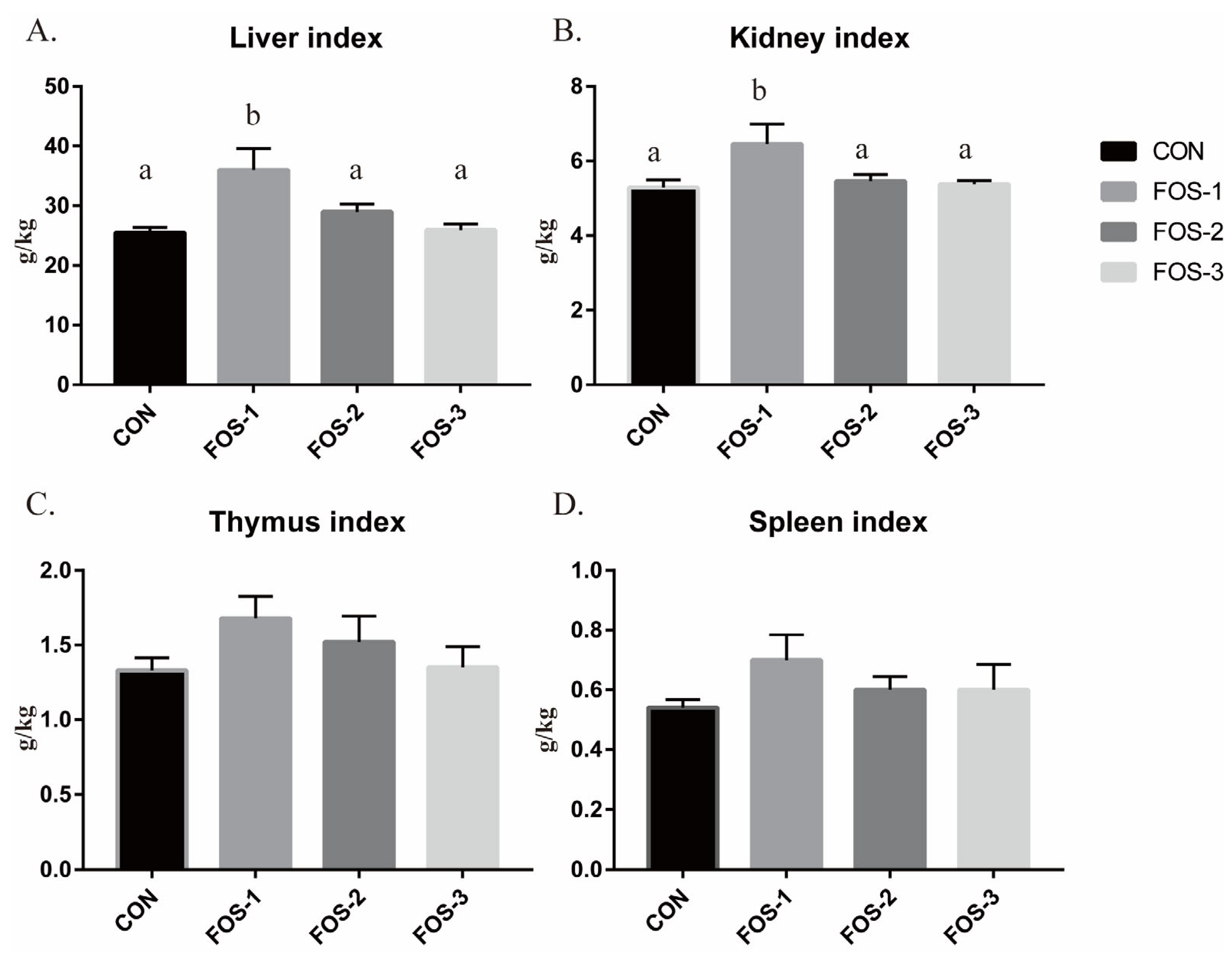 29]. Our results demonstrate that dietary supplementation with 0.3% FOS (FOS-1 group) significantly enhances the liver index and kidney index in rabbits, while having no notable effect on other immune organ indices (