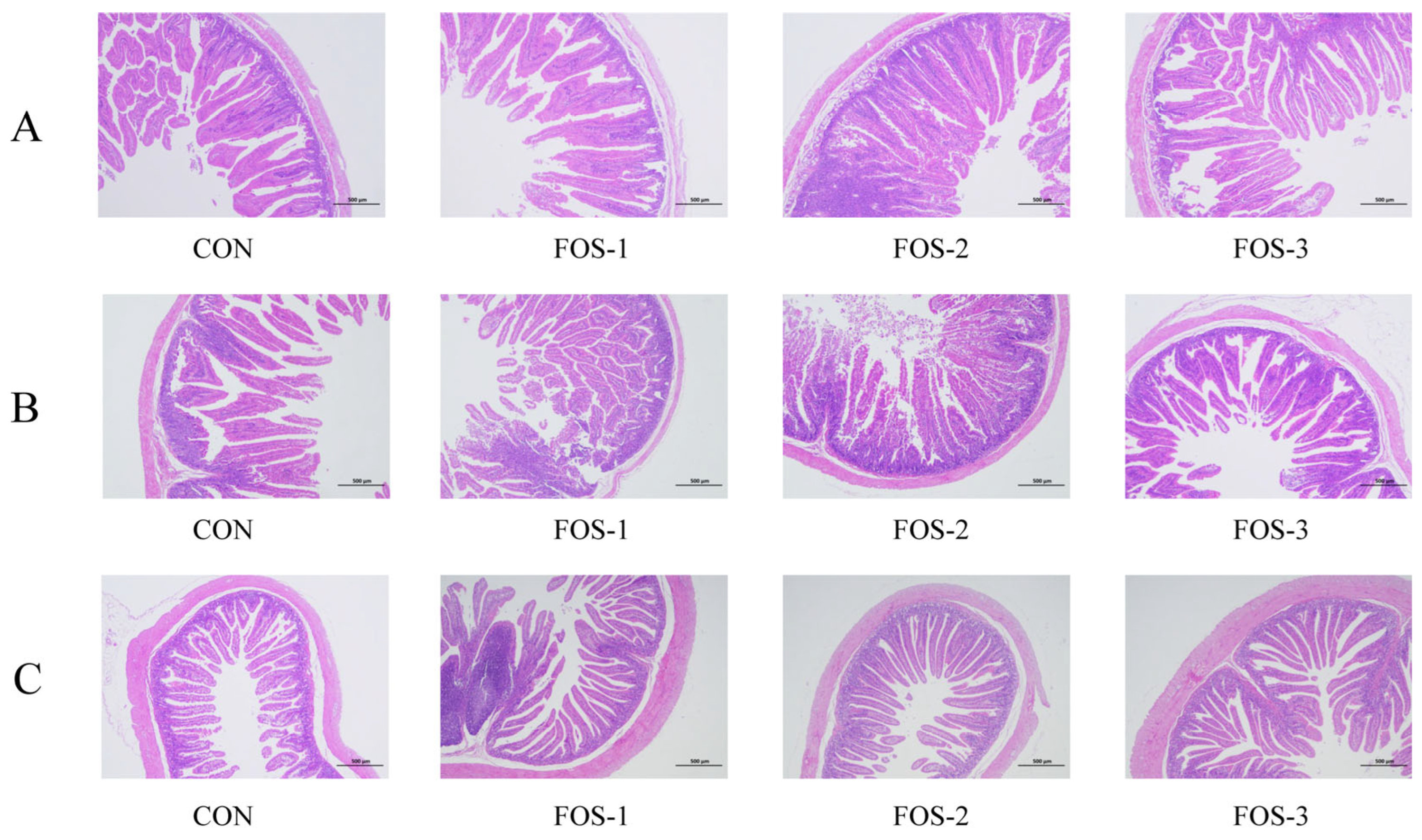 Table 3). The morphological integrity of the small intestine is vital for nutrient absorption and transport. Our results indicate that prebiotics like FOS could optimize small intestine microstructure and facilitate efficient nutrient digestion and absorption. We also found that dietary supplementation with FOS exhibited higher activities of cellulase, lipase, and total protease compared to the CON group (