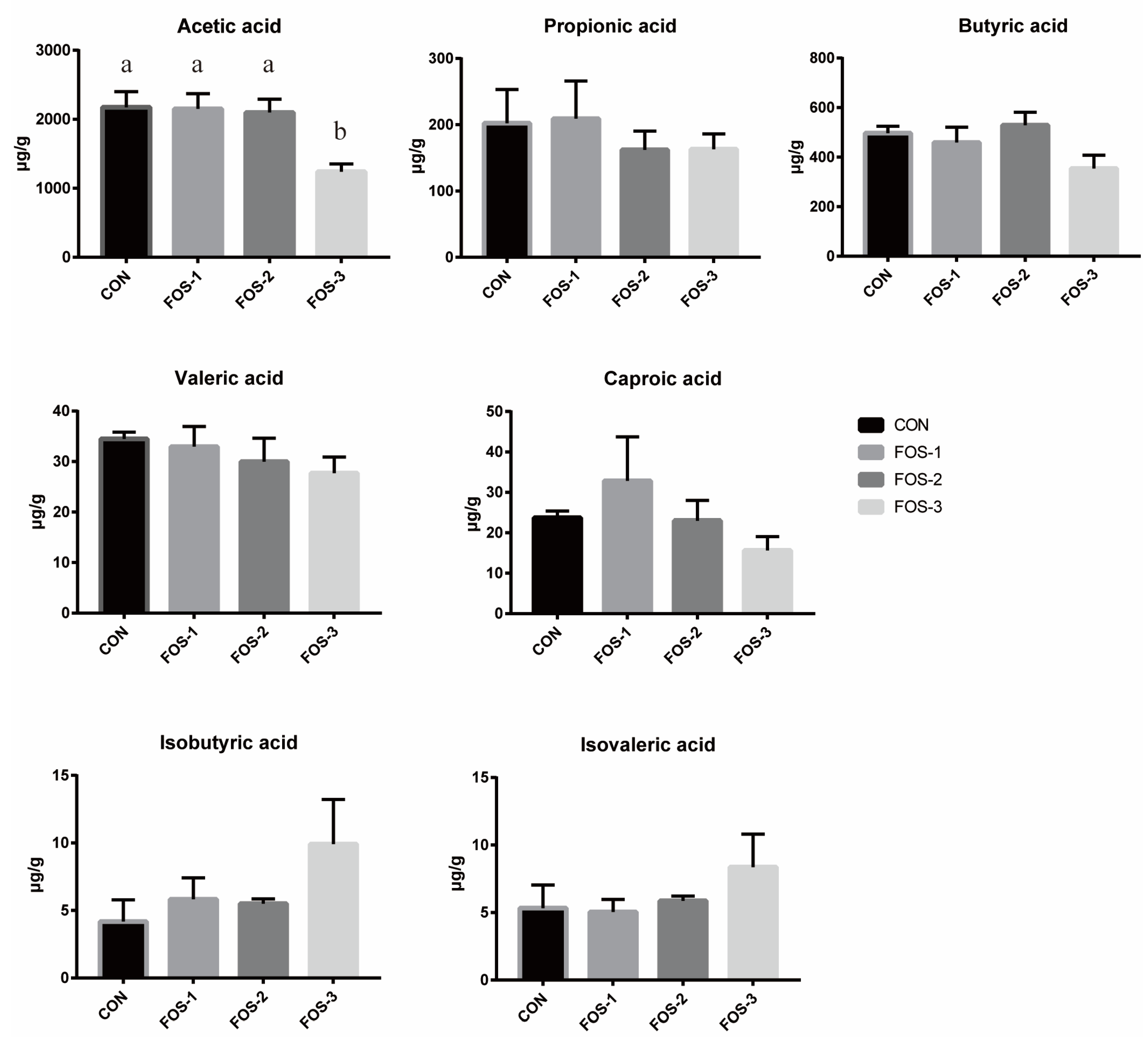 Table 2). This finding indicated that FOS could enhance mineral absorption. However, the concentrations of acetic acid in cecum were notably lower in the FOS-3 group compared to the CON group (