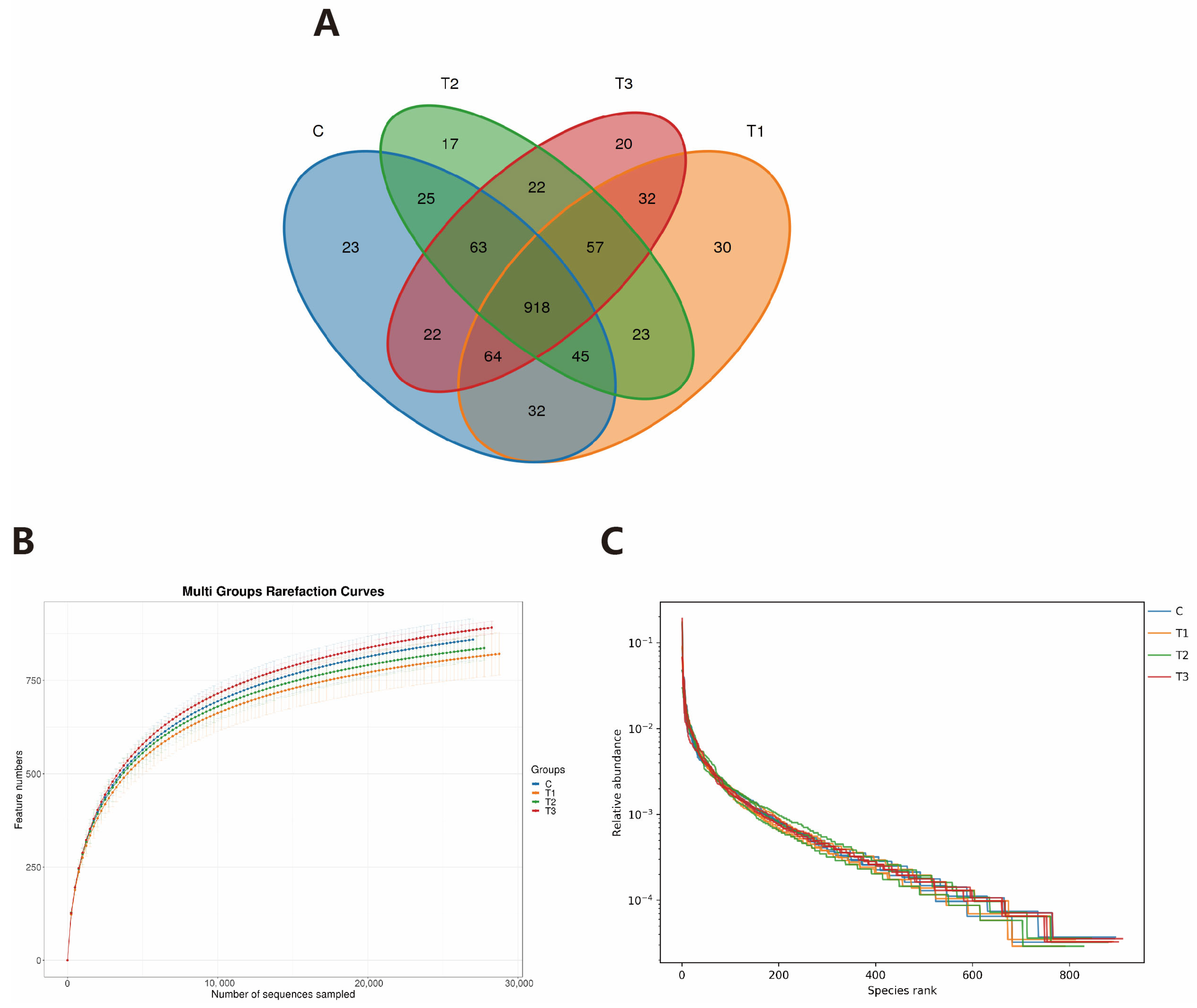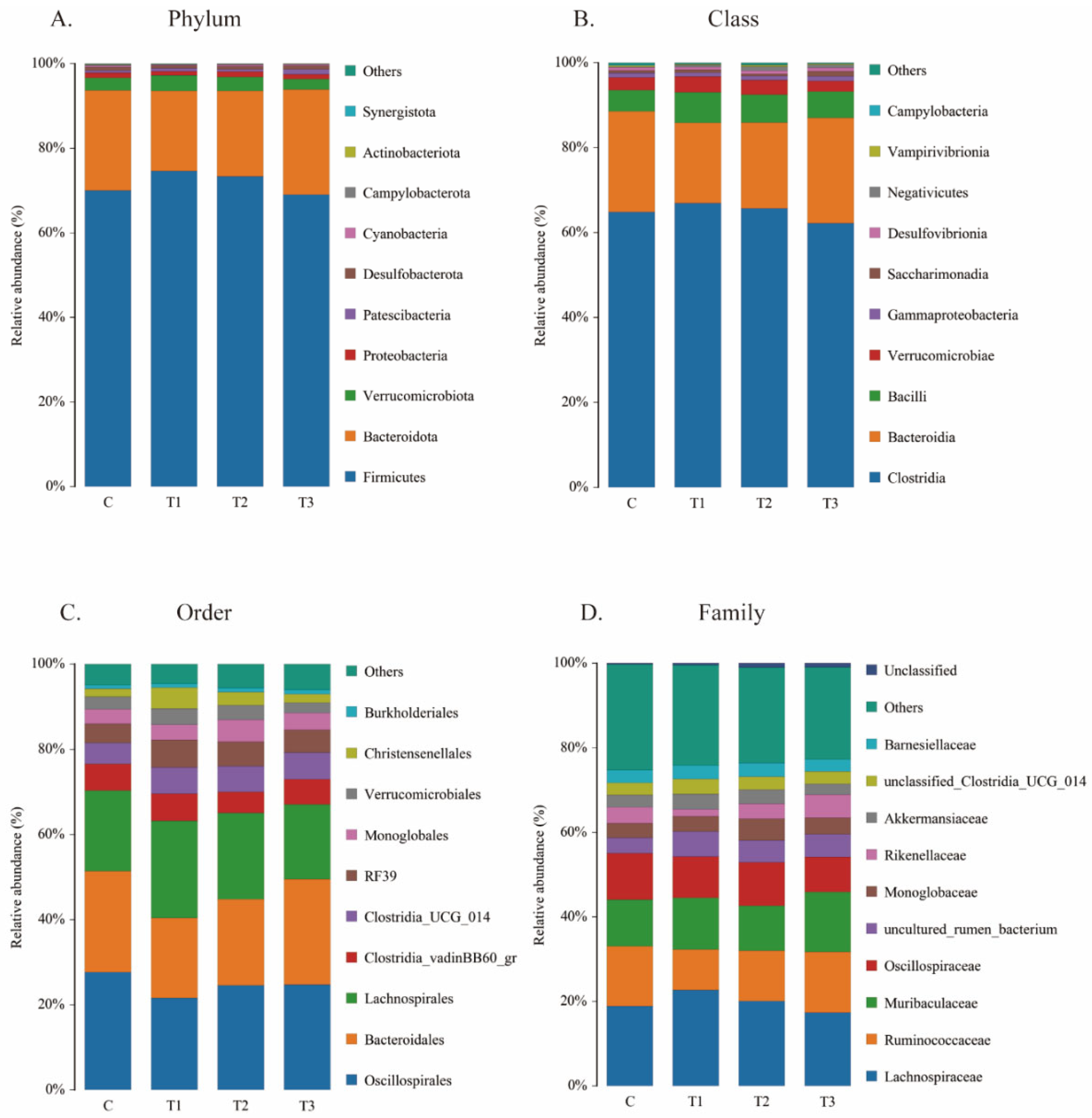 Parts of the cecum were finely homogenized in saline using a homogenizer (FSH-2A, Japid Co., Ltd., Qingdao, China) and centrifuged at 8000 rpm for 5 min, at 4 °C, to obtain the supernatants. The activities of cellulase, lipase, and total protease were measured by commercial assay kits (Shanghai Liquid Quality Testing Technology Co., Ltd., Shanghai, China) according to the instructions of the manufacturer. Samples of cecal contents were aseptically collected in 2 mL Eppendorf tubes and stored at −80 °C until analysis.