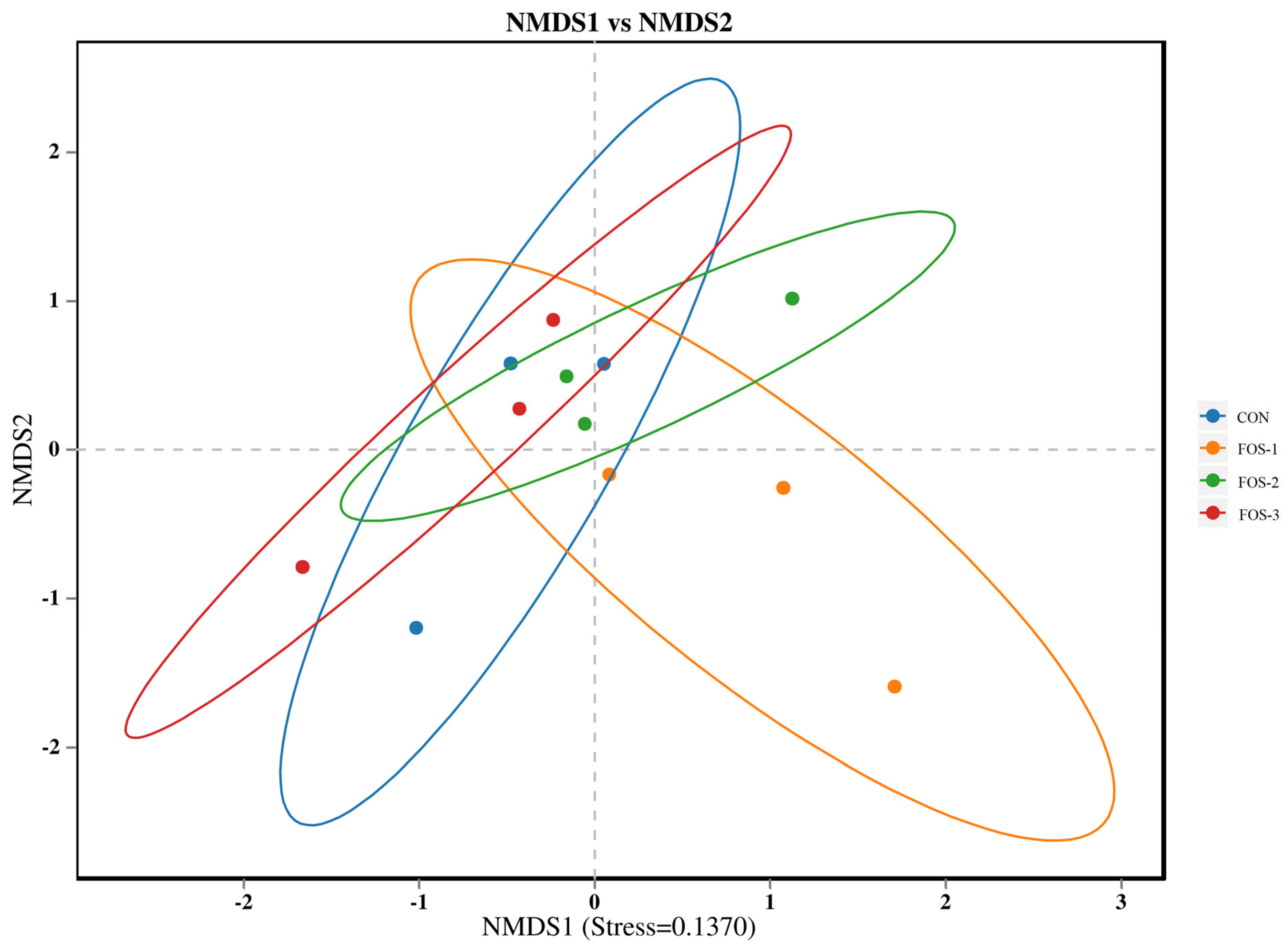 A completely randomized experimental design was employed in this study. All data were analyzed using IBM SPSS Statistics software (version 25.0). Data were first subjected to normality testing using the Shapiro–Wilk test. For datasets conforming to normal distribution, Bartlett’s test was employed to assess homogeneity of variance. When homogeneity of variance was confirmed, one-way analysis of variance (ANOVA) was performed; otherwise (heterogeneous variance or non-normal distribution), the non-parametric Kruskal–Wallis test was applied. Unless otherwise stated, all data met the assumption of homogeneity of variance. The CON group (without FOS supplement in diet) was set as the control. When the ANOVA indicated significant differences among groups, Tukey’s multiple range tests were further employed to determine which specific pairs of groups were significantly different. The results are presented as the mean ± standard error (SEM). The 16S rDNA sequencing data were analyzed on the free online platform of Omicsmart tools (