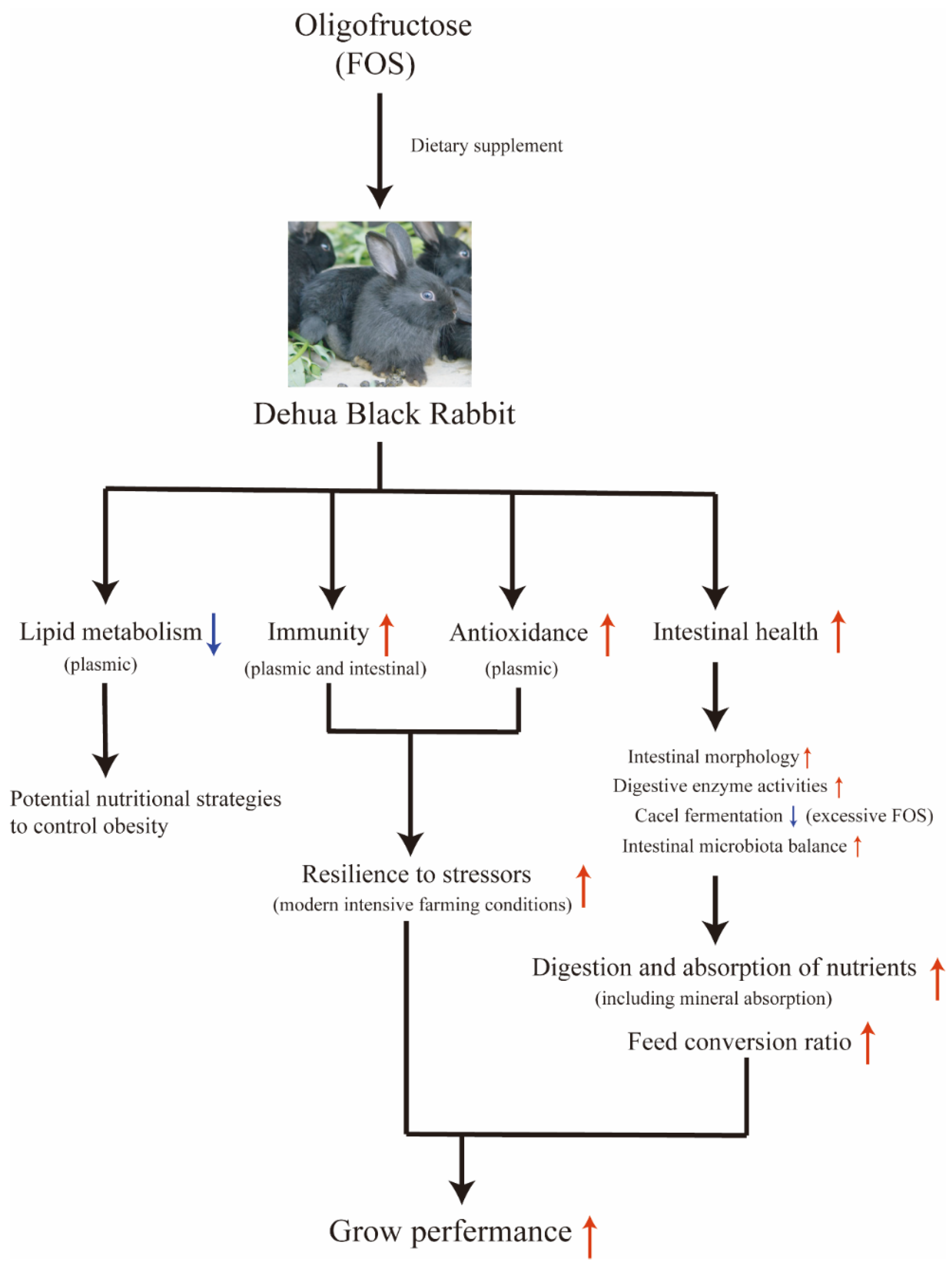 In this study, we employed growing rabbits as an experimental model to systematically investigate the effects of FOS on growing rabbits (