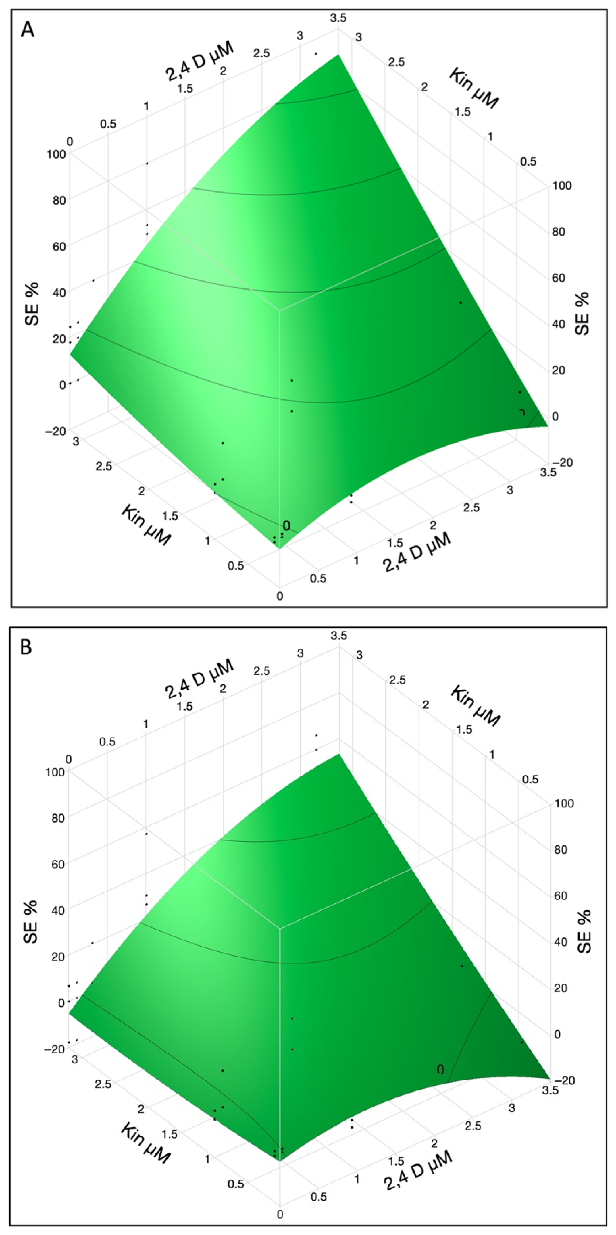 2.1. Effect of PGRs on Somatic Embryogenesis Rate (SE %)
