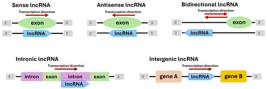 Elucidation of the molecular functions of plant long noncoding RNAs hinges on their classification, revealing their origin and regulatory role. It is usually based on the genomic context of plant lncRNAs with respect to protein-coding genes. For example, they may be intergenic transcripts, introns, or natural antisense transcripts. They may also be associated with regulatory elements, such as enhancers and promoters [,]. Recent studies indicate that the diversity of plant lncRNAs may be underestimated for two main reasons. First, there are challenges in genome annotation. Second, the loci of these molecules dynamically evolve. This underscores the importance of taking a systematic approach to identifying and categorizing them []. On the basis of their location in the genome and orientation of transcription relative to protein-coding genes, lncRNAs can be divided into distinct classes []. According to these criteria, lncRNAs can be divided into five classes (Figure 1).