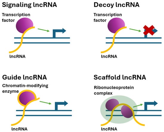 Classes of long noncoding RNAs (lncRNAs) on the basis of their mechanisms of action (signaling lncRNA; decoy lncRNA; guide lncRNA; scaffold lncRNA).