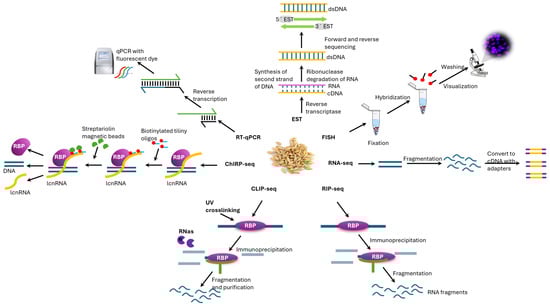 A general strategy for identifying lncRNAs involves high-throughput screening to detect their expression and determine their biological function and mechanism of action on target genes []. The most common methods for analyzing lncRNAs are microarray analysis and RNA sequencing. Off-the-shelf identification chips generated via microarray technology are also available for analyzing lncRNAs in Arabidopsis. Third-generation identification methods based on PacBio and Iso-Seq sequencing technologies and Oxford Nanopore Technologies (ONT) enable the sequencing of full-length RNA transcripts without folding. This improves the accuracy of identifying lncRNAs. RT–qPCR and fluorescence in situ hybridization can be used to verify identified lncRNAs []. Methods based on RNA-binding protein (RIP) immunoprecipitation, chromatin immunoprecipitation (ChIRP), and cross-linking immunoprecipitation (CLIP) can also be used to verify lncRNA targets. Fluorescence in situ hybridization (FISH) is used for localization studies [] (Figure 3).