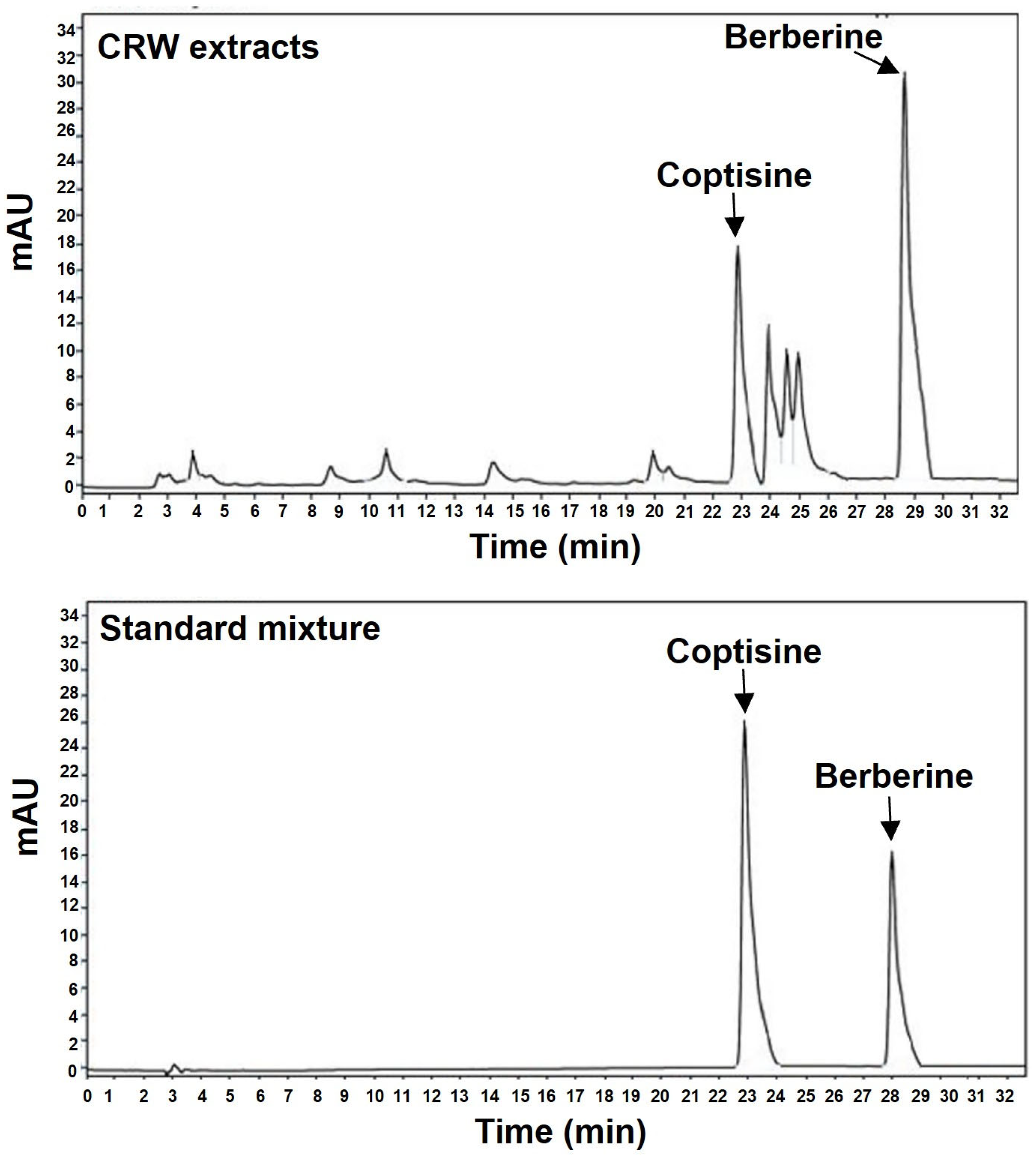 2.1. Determination of Coptisine and Berberine Concentration in CRW
