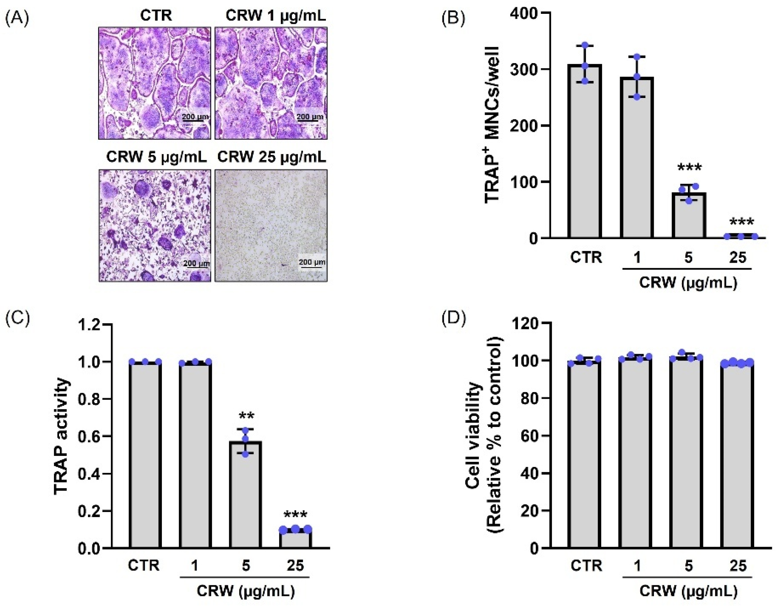 2.2. CRW Blocks RANKL-Activated Osteoclast Differentiation Without Cytotoxicity