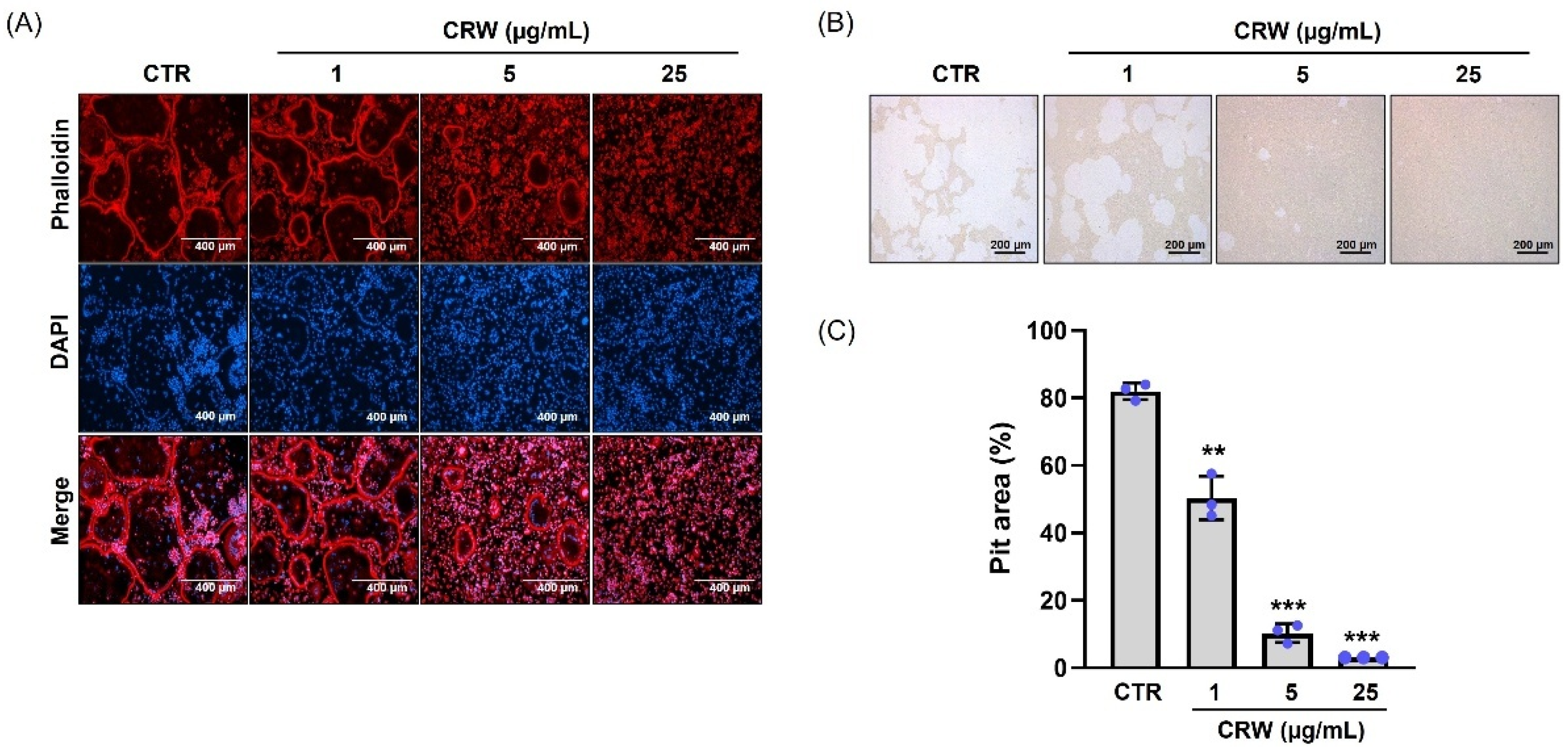 2.3. CRW Suppresses F-Actin Ring and Bone Resorption Activated by RANKL