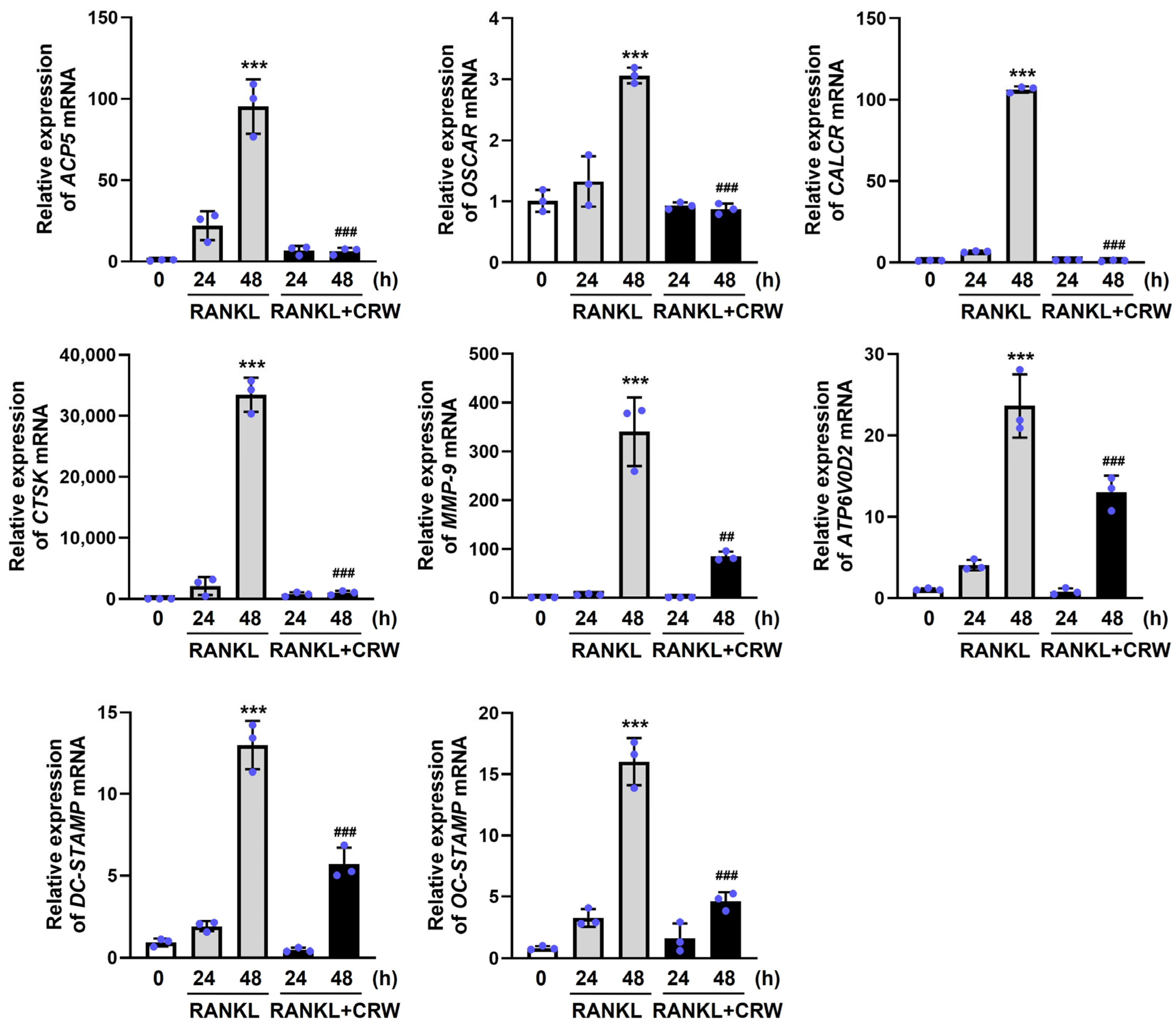2.5. CRW Attenuates RANKL-Activated Induction of Osteoclast Marker Genes