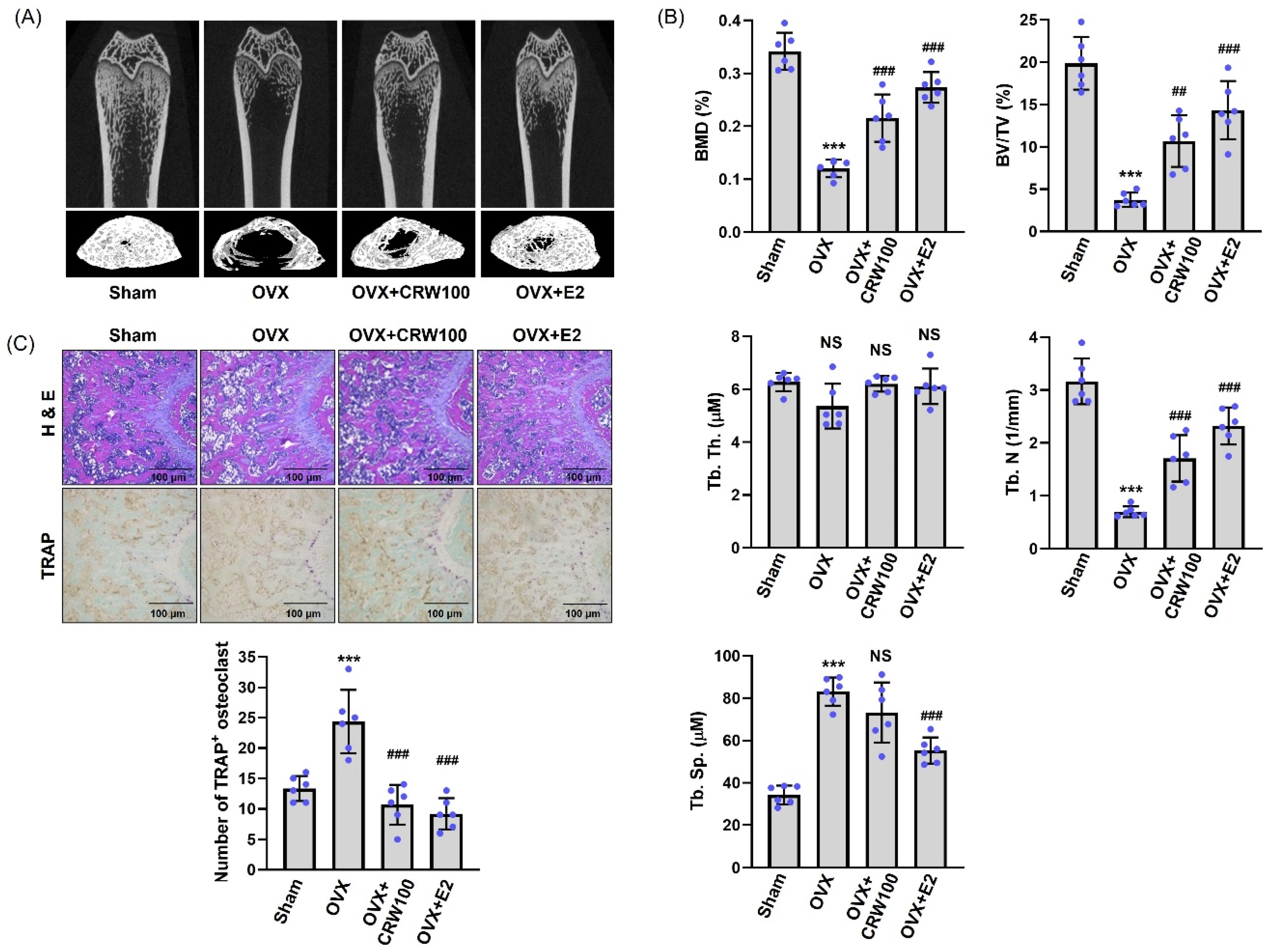 2.7. CRW Recovered Bone Destruction in Ovariectomized Rats