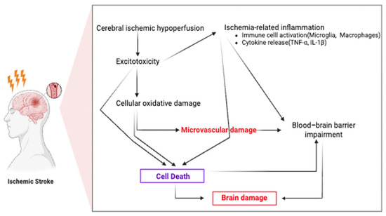 Pathophysiological mechanisms of ischemic stroke. Cerebral ischemia induces hypoperfusion, excitotoxicity, oxidative damage, microvascular dysfunction, and blood–brain barrier breakdown, which contribute to brain injury and inflammation.