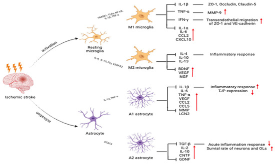 Activation states of microglia and astrocytes after ischemic stroke that affect neuroinflammation and repair. Microglia differentiate into the proinflammatory M1 or anti-inflammatory M2 phenotypes. Astrocytes are polarized into neurotoxic A1 or neuroprotective A2 subtypes. Red upward arrows (↑) indicate an increase in the corresponding cytokines, chemokines, or functional outcomes after ischemic stroke, while red downward arrows (↓) indicate a decrease.