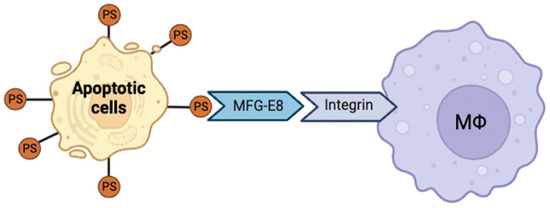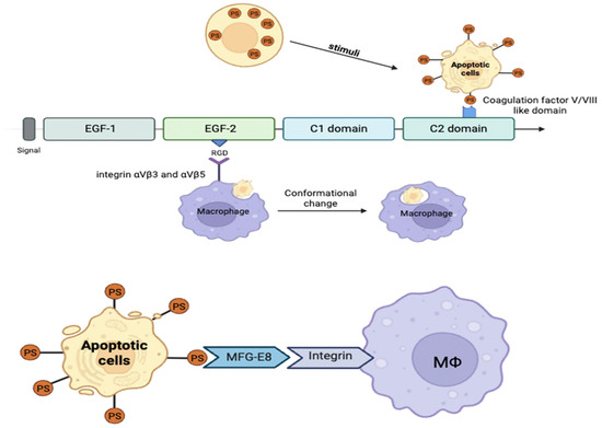MFG-E8 is a critical bridging molecule that mediates the phagocytic clearance of apoptotic cells by recognizing PS as a lipid that is exposed on the surface of dying cells during apoptosis [150,155,160,161]. The F5/8C domain on the C-terminus of MFG-E8 binds specifically to PS [148], whereas the RGD motif in the N-terminal EGF-like domain interacts with αvβ3 and αvβ5 integrins expressed on phagocytes, thereby facilitating the efficient engulfment of apoptotic cells [149,150,151].