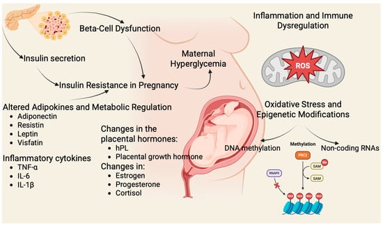 Pregnancy naturally induces a state of progressive insulin resistance, especially in the second and third trimesters, mediated by placental hormones (human placental lactogen (hPL)), prolactin, progesterone, cortisol, estradiol, cytokines, and adipokines (e.g., tumor necrosis factor α (TNF-α), leptin, resistin) [,]. In healthy pregnancies, pancreatic β-cells expand and increase insulin output to maintain euglycemia. In GDM, β-cell compensation fails—often due to genetic defects, weight gain of the mother, and hormonal disorders, leading to maternal hyperglycemia [,,]. Figure 1 illustrates the main molecular mechanisms involved in GDM.