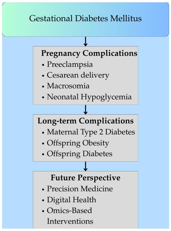 Crucially, GDM has long-term sequelae: women with GDM presented higher chances to develop type 2 diabetes postpartum, especially if they required insulin or had obesity [,]. Offspring born to GDM mothers have higher lifetime risks for childhood obesity, impaired glucose tolerance, type 2 diabetes, hypertension, and cardiovascular disease—often attributable to fetal metabolic programming through epigenetic and microbiome alterations [,,].