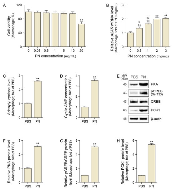 PN activates the A2AR–cAMP–PKA/CREB pathway in senescent macrophages. (A) Cytotoxicity of PN was assessed using CCK-8 assay. (B) Quantitative polymerase chain reaction analysis of A2AR expression in response to PN. (C) Adenylate cyclase level was elevated after PN treatment using assay kit. (D) Cyclic AMP levels increased in PN-treated macrophages using assay kit. (E–H) Western blot analysis revealed increased expression of PKA (F), phosphorylated CREB (pCREB, Ser133), CREB (G), and PCK1 (H) following PN treatment. β-actin served as the loading control. (F–H) Densitometric quantification of the Western blot bands shown in (E). Data are expressed as the mean ± SD. **, p < 0.01, vs. first bar; $, p < 0.05, vs. fourth bar (Mann–Whitney U test). A2AR, adenosine 2A receptor; CREB, element-binding protein; MW, molecular weight; PBS, phosphate-buffered saline; PCK1, phosphoenolpyruvate carboxykinase 1; PKA, protein kinase A; PN, polynucleotides.