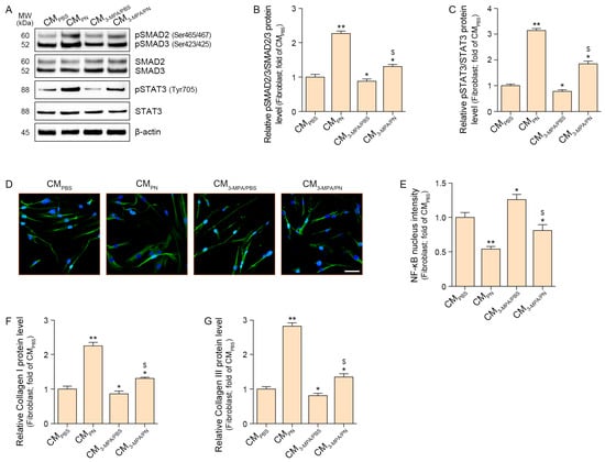 PN regulated increased collagen in PCK1-dependent senescent fibroblasts. (A–C) Western blot analysis showed that the expression levels of phosphorylated SMAD2/3 (pSMAD2 Ser465/467, pSMAD3 Ser423/425; (B) and STAT3 (pSTAT3 Tyr705; (C) were increased. β-actin served as the loading control. (B,C) Densitometric quantification of the Western blot bands shown in (A). (D) Representative immunocytochemistry images for NF-κB localization in senescent fibroblasts (scale bar = 50 μm). (E) Quantification of nuclear NF-κB translocation from (D). (F,G) ELISA analysis showing changes in Collagen I (F) and Collagen III (G) protein levels in senescent fibroblasts treated with macrophage supernatants. Data are expressed as the mean ± SD. *, p < 0.05 and **, p < 0.01, vs. first bar; $, p < 0.05, third bar vs. fourth bar (Mann–Whitney U test). 3-MPA, 3-mercaptopicolinic acid hydrochloride; CM, conditioned media; PBS, phosphate-buffered saline; PN, polynucleotides.