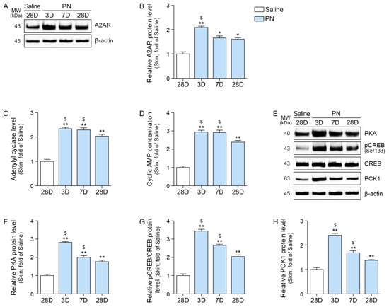 PN activates the A2AR–cAMP–PKA/CREB signaling pathway in mouse skin. (A,B) Western blot analysis of A2AR protein levels in mouse skin at 3, 7, and 28 days after PN treatment. β-actin served as the loading control. (B) Quantification of A2AR expression from (A). (C) Adenylate cyclase level in mouse skin following PN treatment. (D) Cyclic AMP levels in mouse skin following PN treatment. (E–H) Western blot analysis of expression of PKA (F), phosphorylated CREB (pCREB, Ser133), CREB (G), and PCK1 (H) in mouse skin at 3, 7, and 28 days after PN treatment. β-actin served as the loading control. (F–H) Densitometric quantification of the Western blot bands shown in (E). Data are expressed as the mean ± SD. *, p < 0.05 and **, p < 0.01, vs. first bar; $, p < 0.05, vs. fourth bar (Mann–Whitney U test). A2AR, adenosine 2A receptor; CREB, element-binding protein; MW, molecular weight; PCK1, phosphoenolpyruvate carboxykinase 1; PKA, protein kinase A; PN, polynucleotides.