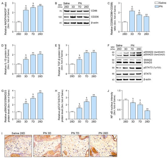 Western blot analysis of the skin was used to assess M2 polarization by quantifying the expression of CD86 and CD206. The extent of M2 polarization was expressed as a ratio of CD206/(CD86 + CD206). The ratio of CD206/(CD86 + CD206) was increased by PN and the highest expression observed 3 days after PN injection (Figure 5B,C).