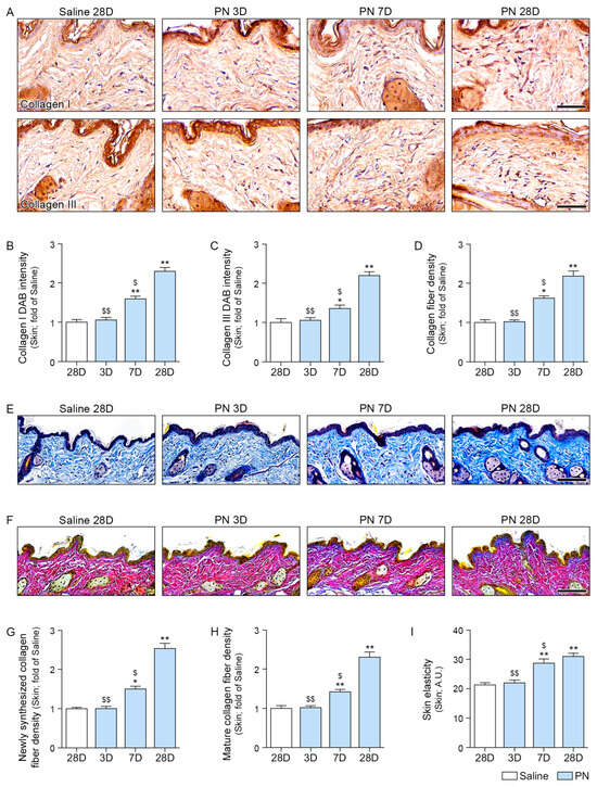 Collagen I and III levels were increased by PN treatment, and this effect became more pronounced over time (Figure 6A–C).
