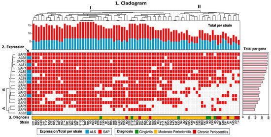 Hierarchical clustering of C. albicans strains. The heat map is segmented into three panels. Top panel: (1) Overall cladogram of the distribution of virulence genotype expression across group I and II strains. Middle panel: (2) ALS and SAP gene expression across strains. A and B expression groups of the ALS and SAP genes in the strains. Bottom panel: (3) Diagnosis and origin of strains. The right panel (pink) shows the absolute frequency of expression by virulence genotype (ALS and SAP). Gene expression across strains is represented in red, and absence is represented in white.
