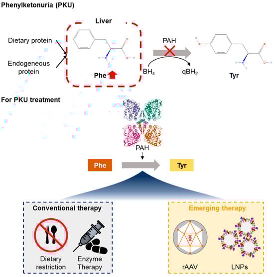 Phenylketonuria (PKU) is an autosomal recessive metabolic disorder with an estimated global incidence of approximately 1 in 10,000 to 15,000 children []. First described in 1934 by Dr. Ivar Følling [], PKU is caused by a deficiency in phenylalanine hydroxylase (PAH), an enzyme primarily expressed in the liver that catalyzes the hydroxylation of phenylalanine (Phe) to tyrosine (Tyr). When PAH activity is deficient or absent, Phe accumulates to neurotoxic levels in the blood and brain, disrupting neurotransmitter synthesis and causing irreversible neurological damage if not treated early [].