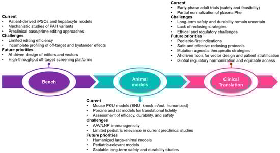 Furthermore, long-term safety, use in the pediatric population, and ethical and regulatory challenges continue to be central issues for clinical application of gene-editing technologies in rare metabolic diseases. Explicit direction from regulators and engagement with patients and families will be essential to ensure the responsible progression of clinical translation. A conceptual scheme is presented in Figure 2 to elucidate the translation pipeline of PKU gene therapy from bench to animal models and clinic, as well as the current developments, key bottlenecks, and future perspectives. These challenges will need to be tackled by the following approaches to achieve long-term clinical translation, such as improved delivery methods, strict long-term surveillance, and mutation-non-specific designs.