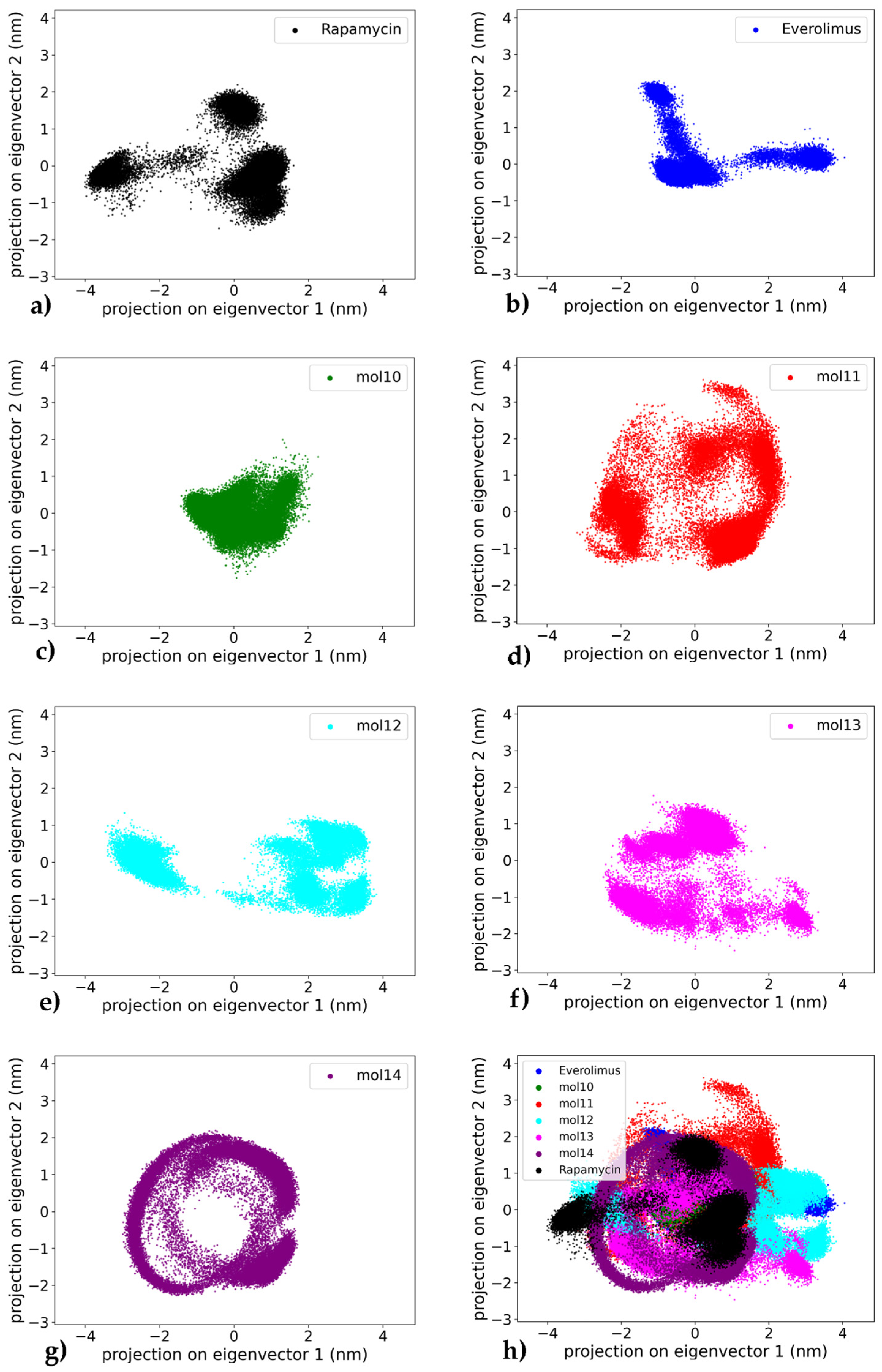 Ligand | MM/PBSA ΔG (kcal/mol) | Ligand RMSD (1 µs) | PCA (Ligand Heavy Atoms) | Most Persistent Interactions (Occupancy, %) |