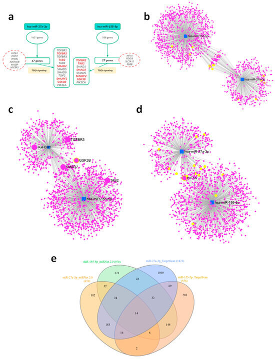 Multilayered analysis of the targets of the selected microRNAs, with emphasis on the TGF-β signaling pathway. (a) Initial target prediction by TargetScanHuman (release 8.0) identifying genes related to the TGF-β pathway, including receptors, SMADs, and modulators. Genes of interest in the pathway are highlighted in red. (b) Gene–miRNA interaction networks generated by miRNet for hsa-miR-27a-3p and hsa-miR-155-5p, highlighting the identified TGF-β pathway genes in yellow. (c,d) Combined target network of both miRNAs, showing overlap and shared interactions, highlighting target genes of TGF-β and HIF-1α signaling. (e) Venn diagram illustrating the intersection between predicted (TargetScan) and validated (miRNet) targets, highlighting common and unique genes for each miRNA.